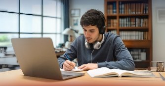 Student practicing listening comprehension with headphones and notes